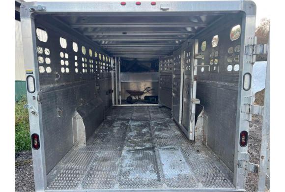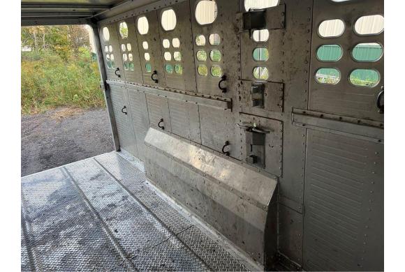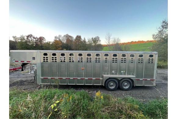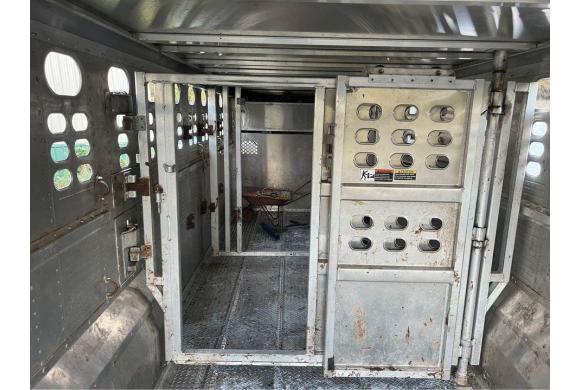 This Foreman trailer was custom built and is premium over the stock model Ranch Hand trailers. It is a 24 foot gooseneck cattle trailer, 90 in. Interior, 7 ft. 9 in. O/A. Height 6 ft. 8 in. Interior. GVWR 14,000 #. 2 Dexter 7,000 # axles, 102 in. wide. Electric over hydraulic brakes. 6.00 X 16 8-lug wheels, ST235/85R16 10 ply radial tires. 12,000# drop leg, spring loaded landing gear. 2 interior doors, 1 stationary with inner slide, and one movable with full swing. Rear door full swing with slide. Curb side 33” side door.